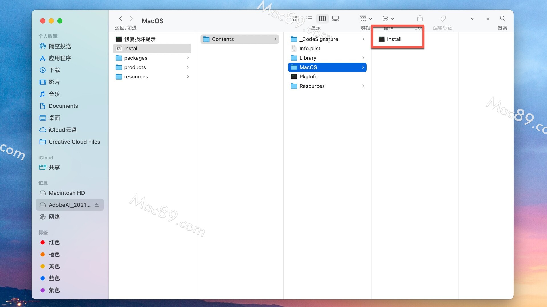 【显示包内容】【contents】找到【macos】,找到【install】双击安装
