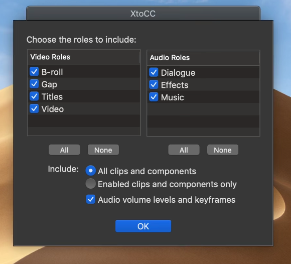 XtoCC是一款专门用于将FCPX转换成PR时间线的APP工具,目前只有Mac版本,但转换后的XML文件可以被PC上的PR导入识别并编辑。这款工具在FCP7的时代名字叫做Xto7,是苹果Apple以及Adobe官方推荐的Final Cut Pro与Premiere Pro转换的APP。经过无数次的测试,XtoCC被证明是非常好的FCPX转PR的解决方案。